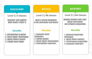 Start your guitar journey with our comprehensive curriculum. Level 1 is perfect for beginners, Level 2 takes you to the intermediate level, and Level 3 is designed for advanced players. Learn at your own pace and become a master guitarist.